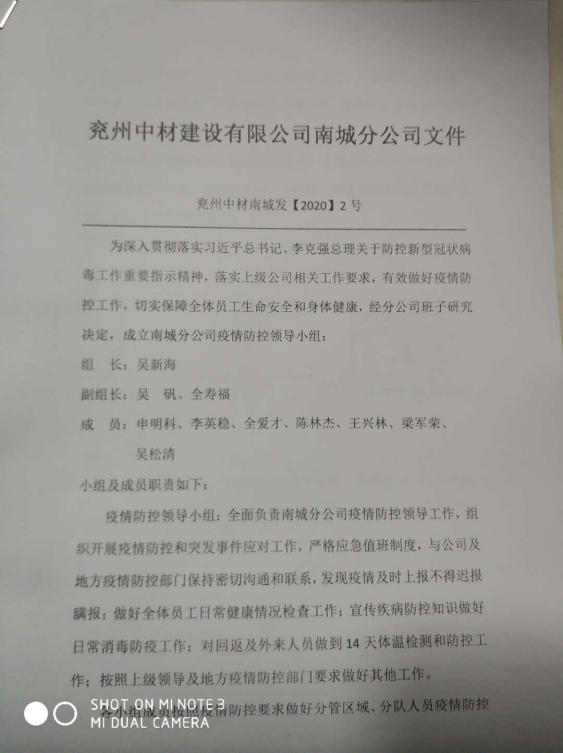 2020年伊始,一場突如其來的新冠疫情爆發(fā)于武漢,肆虐于全國,不斷攀升的疫情數(shù)據(jù)牽動著每個人的神經(jīng)。集團和公司對此次疫情高度重視,要求各下屬單位全力以赴應(yīng)對疫情。為此南城分公司積極響應(yīng)號召,全力開展疫情防控工作,堅持“疫情就是命令,防控就是責(zé)任”的原則,堅決打好疫情防控攻堅戰(zhàn)。 一、加強組織領(lǐng)導(dǎo),強化防控意識 分公司以深入貫徹落實集團公司文件精神為目標(biāo),密切配合當(dāng)?shù)卣ぷ?,成立以吳新海同志為首的疫情防控領(lǐng)導(dǎo)小組,細化人員責(zé)任,明確組織分工,從思想高度做好打贏防疫攻堅戰(zhàn)的準(zhǔn)備。