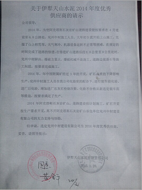 兗州中材建設(shè)有限公司被伊利天山水泥評(píng)為2014年度優(yōu)秀供應(yīng)商