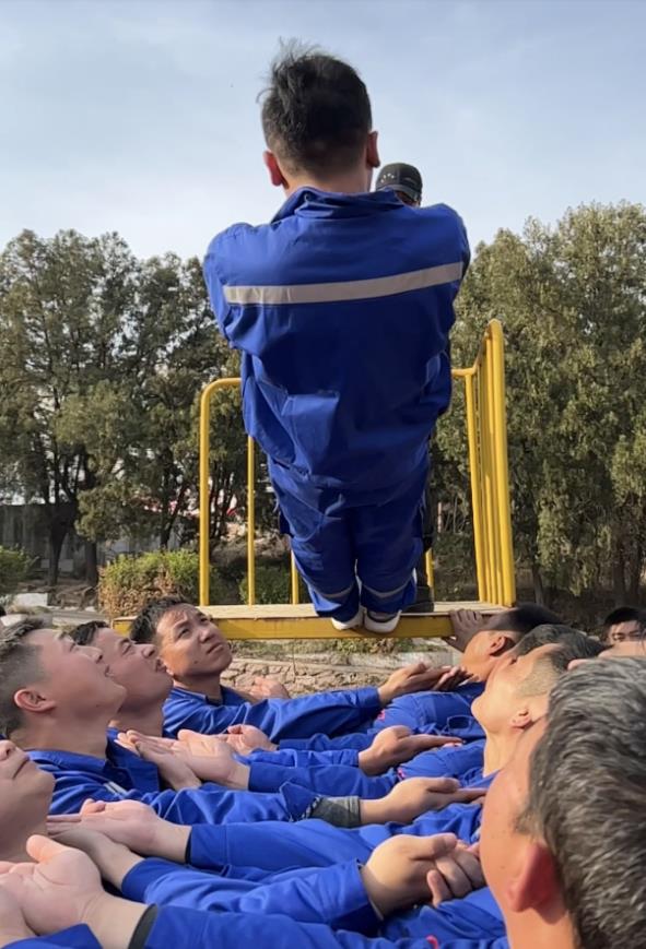 最后一個拓展項(xiàng)目“畢業(yè)墻”,墻高4.2米,要求在沒有任何工具的情況下翻過這面墻,剛開始每個人心里都微微一驚。最后,在教官的帶領(lǐng)下,員工們克服恐懼心理,團(tuán)結(jié)協(xié)作,眾志成城,全部翻過了畢業(yè)墻,他們揮舞著旗幟,高聲吶喊“我們勝利了”!兗州中材公司就是這樣一個充滿激情的團(tuán)隊(duì),員工們翻過了拓展訓(xùn)練營的畢業(yè)墻,相信在工作中也一定能夠翻過他們心中的“畢業(yè)墻”。