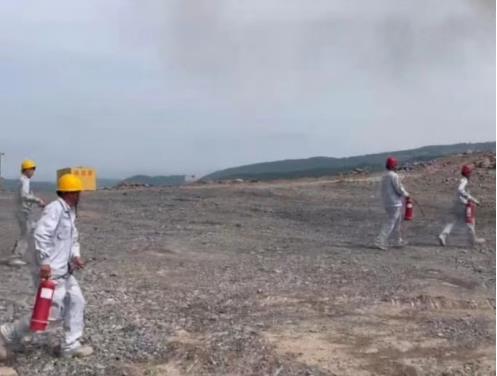 此次演練,災(zāi)情設(shè)定挖掘機(jī)在進(jìn)行焊接作業(yè)時(shí),焊接火花飛濺引燃一旁維修時(shí)使用的擦拭油料的棉紗,由于維修位置靠近清表時(shí)砍伐的樹木且臨近礦區(qū)邊緣林區(qū),由于當(dāng)天風(fēng)勢(shì)較大待發(fā)現(xiàn)時(shí)被砍伐的樹木已被引燃且火勢(shì)洶涌,發(fā)現(xiàn)火災(zāi)事故的員工立即通知帶班領(lǐng)導(dǎo)。帶班領(lǐng)導(dǎo)接到報(bào)告后,立即啟動(dòng)應(yīng)急預(yù)案,組織人員進(jìn)行滅火。