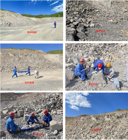 本次應(yīng)急演練事故假定:由于現(xiàn)場管理人員未發(fā)現(xiàn)挖裝區(qū)上部已有裂縫的邊坡,汽車駕駛員并將車輛停放在采場+1260平臺靠近邊坡處檢查車輛,未觀察周圍及邊坡穩(wěn)定情況,突然邊坡坍塌,將汽車駕駛員腿部砸傷,現(xiàn)場員工發(fā)現(xiàn)后立即上報(bào)現(xiàn)場負(fù)責(zé)人。