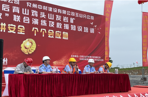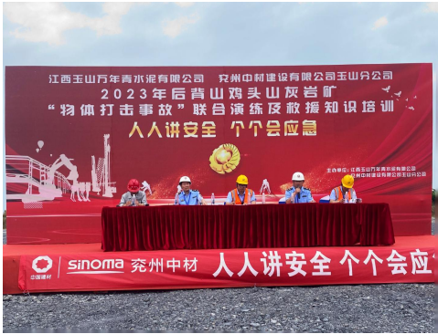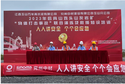 為深入宣貫黨的二十大精神和習(xí)近平總書記關(guān)于安全生產(chǎn)重要論述,進(jìn)一步樹牢“以人為本、安全發(fā)展”的安全生產(chǎn)管理理念,貫徹“安全第一、預(yù)防為主、綜合治理”的安全生產(chǎn)方針,強(qiáng)化非煤礦山事故應(yīng)急救援管理工作和應(yīng)急救援隊(duì)伍建設(shè),切實(shí)提高分公司應(yīng)對礦山突發(fā)事故的聯(lián)合應(yīng)急救援綜合能力,6月17日,兗州中材玉山分公司聯(lián)合江西玉山萬年青水泥有限公司、玉山縣藍(lán)天救援隊(duì)、玉山縣人民醫(yī)院等舉辦2023年“物體打擊事故”聯(lián)合演練及救援知識培訓(xùn)活動。玉山縣應(yīng)急管理局局長吳高峰、玉山萬年青水泥有限公司總經(jīng)理李躍華等出席本次活動并致辭。