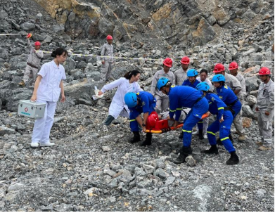 演練開始,總指揮張鵬收到現(xiàn)場有發(fā)生塊石滾落,造成現(xiàn)場技術(shù)員腿部受傷請求救援的緊急報告,立即下達(dá)指令啟動分公司應(yīng)急預(yù)案,并對本次救援進(jìn)行全面組織部署,對分公司警戒保衛(wèi)組、搶先救援組、醫(yī)療救護(hù)組、通訊聯(lián)絡(luò)組等下達(dá)指令,各小組在接到指令后立即響應(yīng)應(yīng)急預(yù)案,第一時間到達(dá)事故發(fā)生地,按秩序組織搶險救援,對傷員進(jìn)行緊急救治并對事故發(fā)生地進(jìn)行警戒隔離。