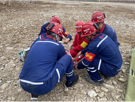 受傷人員救出后,醫(yī)療救護(hù)組進(jìn)入現(xiàn)場,通過傷情檢查,發(fā)現(xiàn)傷員腿部受傷,立即對傷員進(jìn)行救治