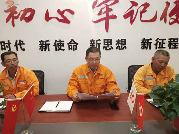 按上級黨委統(tǒng)一部署,寧陽項目部于9月23日晚召開全體員工結(jié)合中材礦山劉書記講話精神,開展“不忘初心,牢記使命”主題教育活動。 會上,劉經(jīng)理首先帶領(lǐng)全體員工認(rèn)真學(xué)習(xí)《在中材礦山建設(shè)有限公司開展“不忘初心,牢記使命”主題教育部署會上的講話》。全體員工分別針對“不忘初心,牢記使命”主題教育活動展開發(fā)言討論。最后,根據(jù)《在中材礦山建設(shè)有限公司開展“不忘初心,牢記使命”主題教育部署會上的講話》會議精神,劉經(jīng)理呼吁全體員工要積極努力地向黨靠攏,今后更加緊密團(tuán)結(jié)在以習(xí)近平同志為核心的黨中央周圍,高舉習(xí)近平新時代中國特色社會主義思想偉大旗幟,扎實做好“不忘初心,牢記使命”主題教育工作,為全面完成集團(tuán)和股份公司下達(dá)的各項經(jīng)濟(jì)指標(biāo)而努力奮斗,以優(yōu)異的成績迎接新中國成立70周年   |