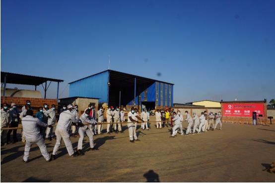 舉行以各生產(chǎn)部門為團(tuán)隊的拔河比賽,圖片為中方員工組成團(tuán)隊與贊方員工比賽圖。